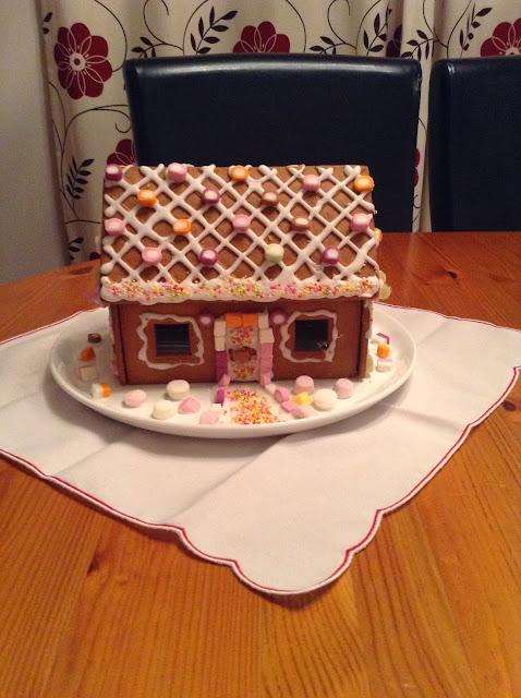 Finally, just thought I'd share our family gingerbread house with you. This is the first we have ever decorated (bought in Ikea - no domestic goddess here). The three of us set ourselves up on Sunday afternoon to get creative with the royal icing and dolly mixtures. To our surprise hubby took quite well to this task (not known for his creative patience) and we had a great afternoon's messing and burning our fingers on hot sugar glue! I think we may have founded a new Christmas family tradition!