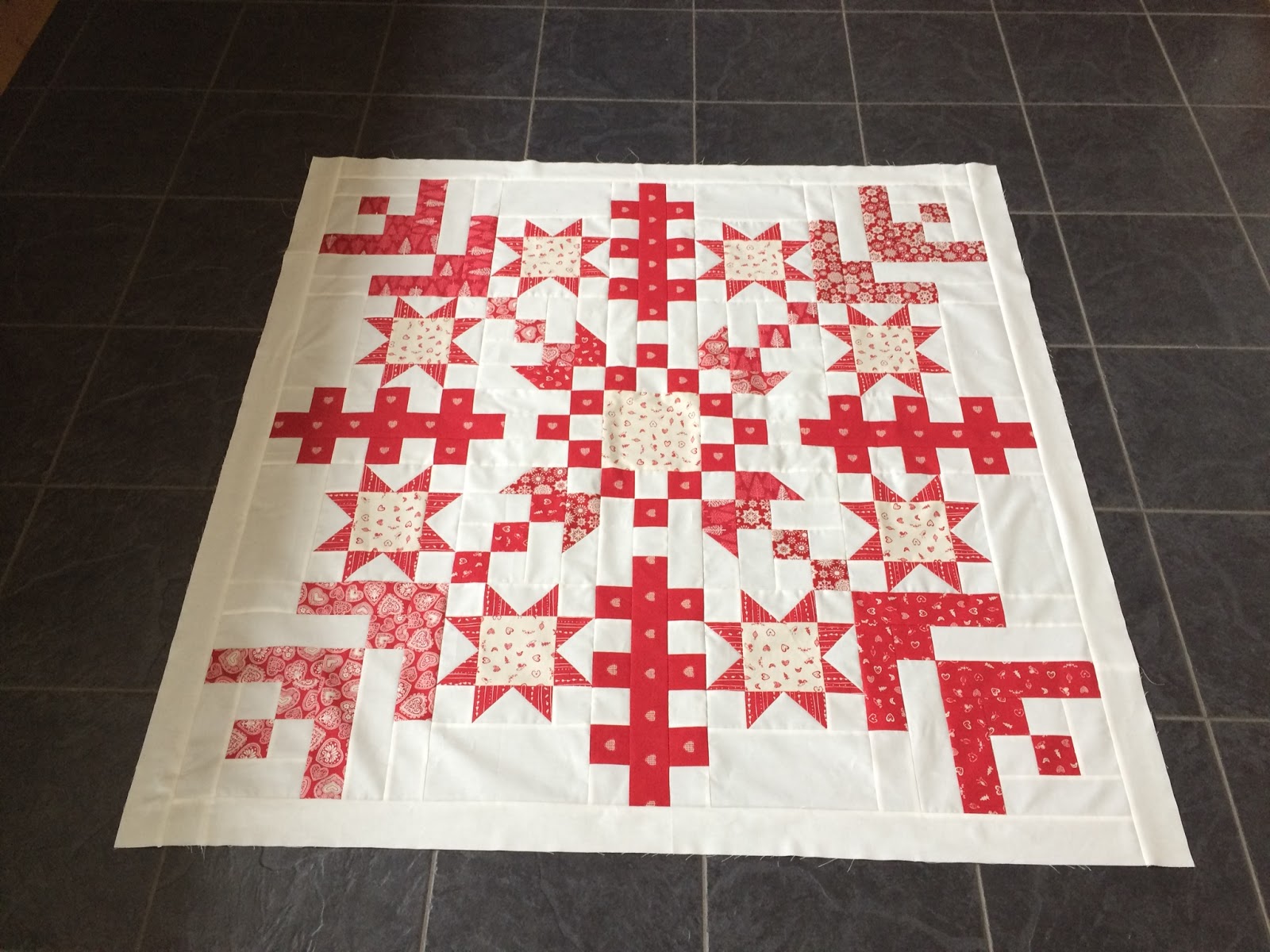 It turned out to be just a 6.5" square of background. Lots of folks in the IG # opted to piece alternative centres - lots of them look amazing - but I chose to add a square of the same cream/red contrast fabric that I used in the centre of the sawtooth stars. It works well for me.